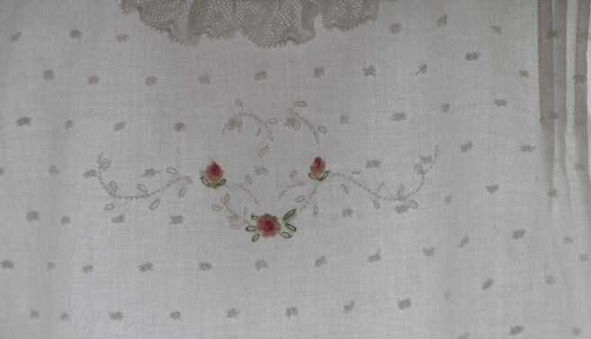 This dress features gorgeous 100% white cotton dotted swiss, tucks, entredeux and lace edging on the neck, sleeves and hem. Hand embroidery with either shadow work Peter Rabbit, Jemima Puddle Duck or sweet bullion flowers is available.