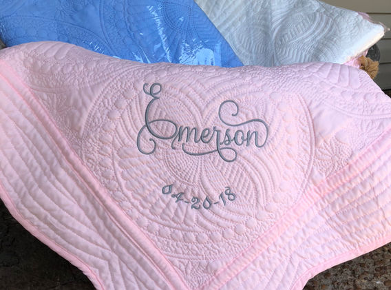 Quilts can be ordered with a monogram or blank - please specify choices when ordering. Specify your monogram in the ext box provided. I can use any color thread for the monogram and most often on the color edge quilts I match the thread to the color.